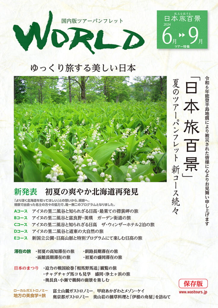 少し奥まった地域に伝承されてきた古くからの民俗芸能や昔ながらの建築を残し、今も生活を営んでいる集落など、日本には地方独自の文化を継承してきた素晴らしい文化的景観がたくさんあります。「いつまでも残したい日本」をご紹介するワールド航空サービスの国内ツアー『日本旅百景』パンフレット(2024年6月〜9月出発 夏の国内ツアーパンフレット)ができました。単なるツアー募集パンフレットをこえて、読み物としても楽しめます。どうぞ皆様のご参加をお待ちしています。