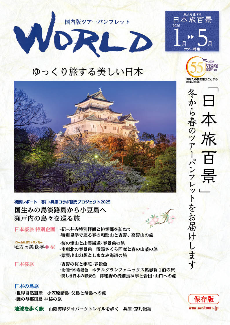 少し奥まった地域に伝承されてきた古くからの民俗芸能や昔ながらの建築を残し、今も生活を営んでいる集落など、日本には地方独自の文化を継承してきた素晴らしい文化的景観がたくさんあります。「いつまでも残したい日本」をご紹介するワールド航空サービスの国内ツアー『日本旅百景』パンフレット(2026年1月〜5月出発 冬から春のツアーパンフレット)ができました。単なるツアー募集パンフレットをこえて、読み物としても楽しめます。どうぞ皆様のご参加をお待ちしています。