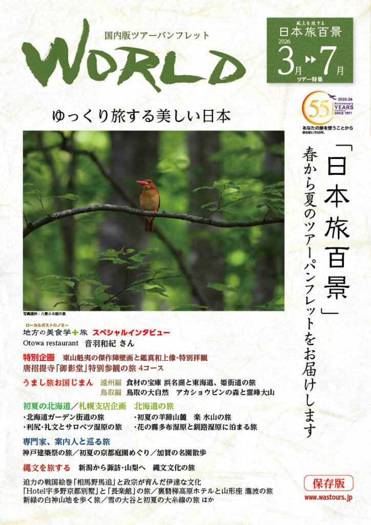 少し奥まった地域に伝承されてきた古くからの民俗芸能や昔ながらの建築を残し、今も生活を営んでいる集落など、日本には地方独自の文化を継承してきた素晴らしい文化的景観がたくさんあります。「いつまでも残したい日本」をご紹介するワールド航空サービスの国内ツアー『日本旅百景』パンフレット(2026年3月〜7月出発 春から夏のツアーパンフレット)ができました。単なるツアー募集パンフレットをこえて、読み物としても楽しめます。どうぞ皆様のご参加をお待ちしています。