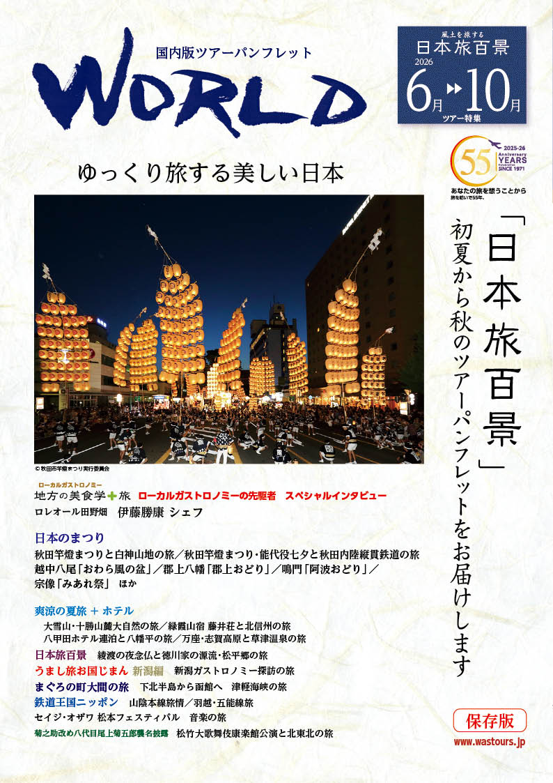 少し奥まった地域に伝承されてきた古くからの民俗芸能や昔ながらの建築を残し、今も生活を営んでいる集落など、日本には地方独自の文化を継承してきた素晴らしい文化的景観がたくさんあります。「いつまでも残したい日本」をご紹介するワールド航空サービスの国内ツアー『日本旅百景』パンフレット(2026年6月〜10月出発 初夏から秋のツアーパンフレット)ができました。単なるツアー募集パンフレットをこえて、読み物としても楽しめます。どうぞ皆様のご参加をお待ちしています。