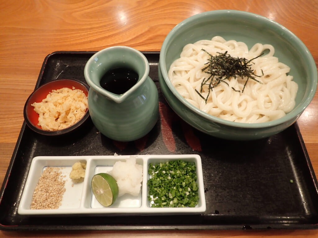 まず1店目は、高松駅から至近に位置する「めりけんや 高松駅前店」。小麦粉・塩・水、全ての材料にこだわりを持ち、熟練の製法により、「味よし、コシよし、ツヤよし、ハダよし」の讃岐うどんが完成します。注文はシンプルで、温冷問わず店員さんがうどんを用意してくれ、あとは好みの付け合わせを選ぶのみ。早朝に訪れましたが結構な込み具合で、皆さん、黙々と召し上がっていらっしゃるのが印象的でした。