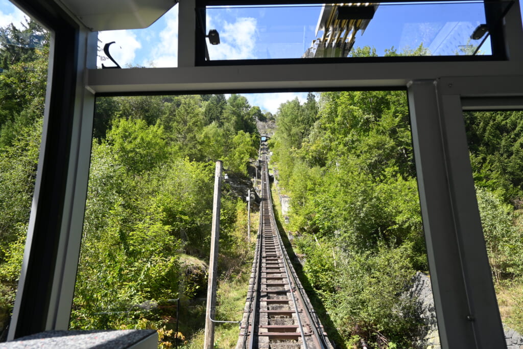 87度の急勾配をケーブルカーで上がります。遊園地のアトラクションのようなスリルがありました