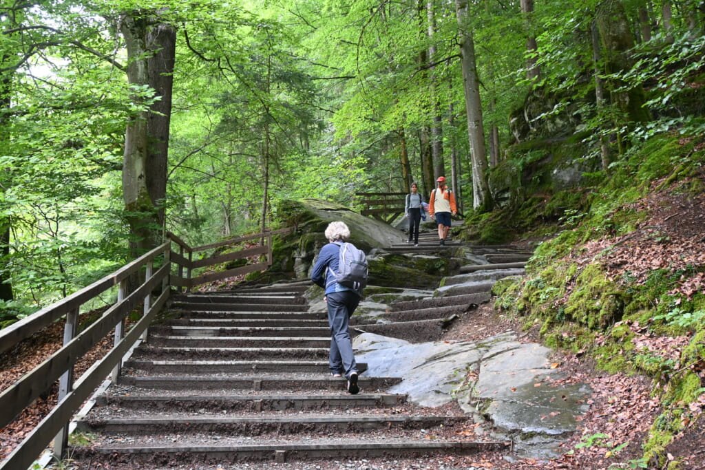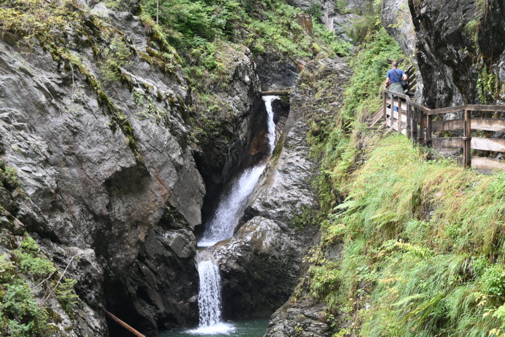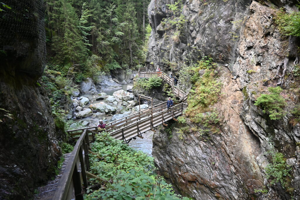シャモニーからモンブラン・エクスプレスに乗って約30分とアクセスしやすいセルヴォにディオサ渓谷があります。エギーユ・ルージュ山脈を水源とする川が長い歳月をかけて形成した渓谷で、自然美を堪能できるよう、断崖沿いに遊歩道が設けられています。遊歩道は階段も多くありますが、整備された木道なので歩きやすく、勢いよく流れる滝の迫力を間近に感じます。山は見えない場所なので、曇りの日でも十分に楽しめる散策ルートです(悪天候の場合には閉鎖される場合もあります)。