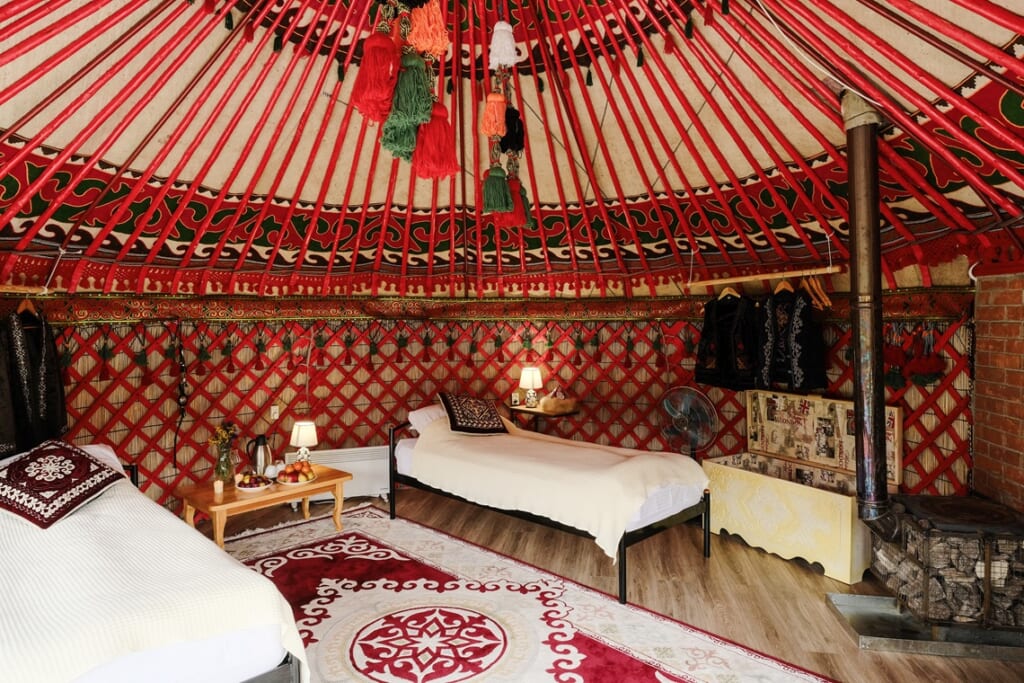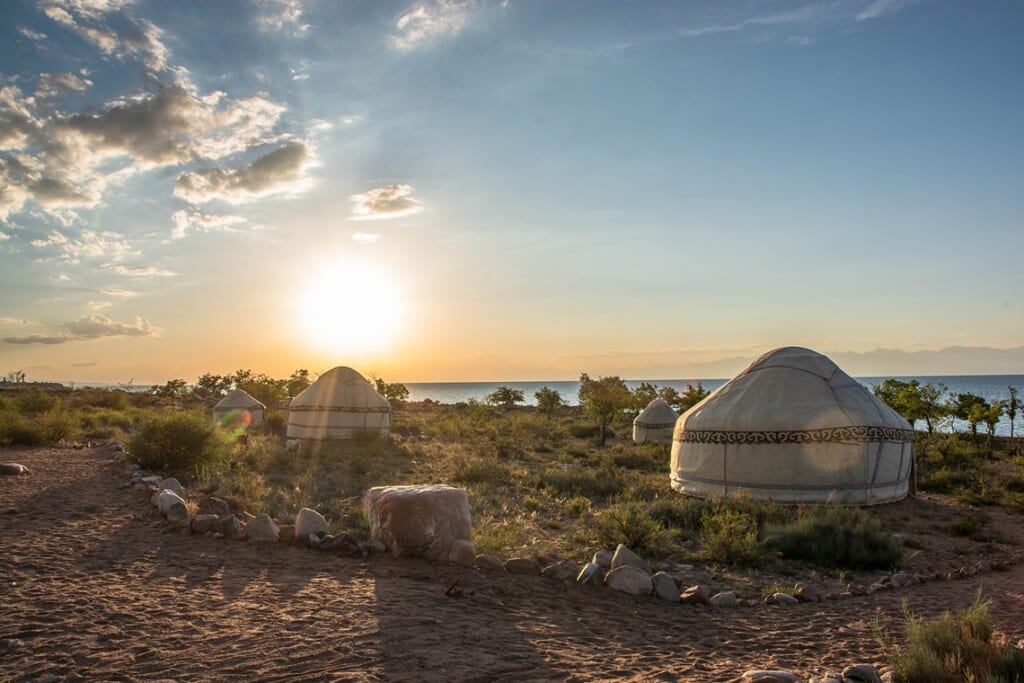 2023年11月、来日したキルギス共和国大統領サディル・ジャパロフ閣下より、「近年のキルギスには、伝統的な遊牧民のテント『ユルト』を現代的にアレンジしたグランピング施設が誕生している」との話がありましたが、このイシククル南岸は北岸のリゾートが並ぶエリアとは印象が異なり、一本の道路の車窓にはただイシククル湖と天山支脈の風景が見えました。そこに、大統領閣下も話していた新しい宿泊施設がいくつかできてきており、これはぜひ皆様にご紹介したいと2人の意見が一致しました。