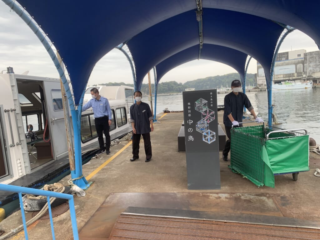 観光を終えて、那智勝浦港へ移動すると、ホテルのスタッフが出迎えてくれ、ホテルの専用船に乗り込み5分ほどであっという間に「一島一旅館」の宿、『熊野別邸 中の島』に到着。那智勝浦港周辺には紀の松島と呼ばれる大小さまざまな奇岩や小島が浮かび、中の島はそのひとつ。専用船でしか行くことのできないプライベート空間です。宿の自慢のひとつでもある100パーセントかけ流しの絶景露天風呂もご堪能いただけたました。夕食は「熊野の恵」にて、前菜に始まり勝浦産マグロと梅真鯛、活きアワビのバター焼き、熊野和牛しゃぶ肉の陶板焼きなど和歌山と勝浦の恵みをお召し上がりいただきました。