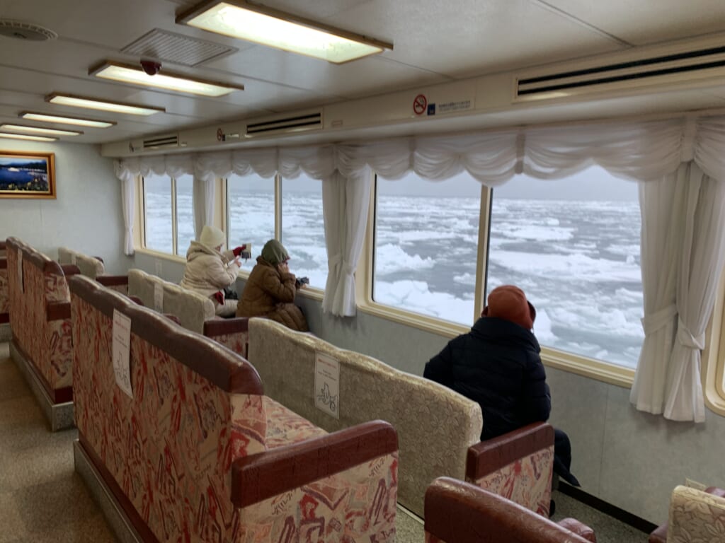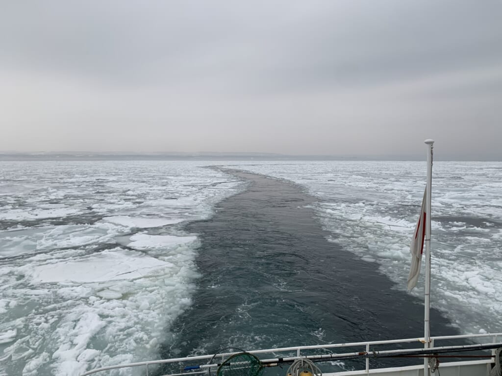 流氷に覆いつくされたオホーツク海を進む砕氷船に乗車