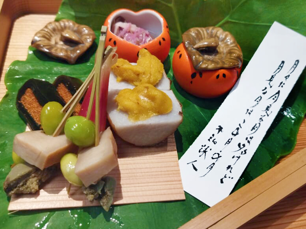 宿の名前は荘子の禅語「静座して現世の世界を離れ、雑念を忘れる」に由来しています。ライブラリーラウンジはその名の通り、都会の喧騒を忘れさせてくれる空間で、観光でも訪れた日本最古のワイナリー「まるき葡萄酒」のワインなどの様々なお飲み物とともにくつろぐことができました。お食事は旅館内にある「懐石まる喜」にて、茶料理ならではのおもてなしを感じました。食前には一口サイズのお米と汁物でお腹を整え、食事の中盤には箸洗いというほんの少しのお塩で味を整えられたお出汁、食後には濃茶と和のフルコース。残暑が続いていますが、お料理からひと足早い秋を感じました。