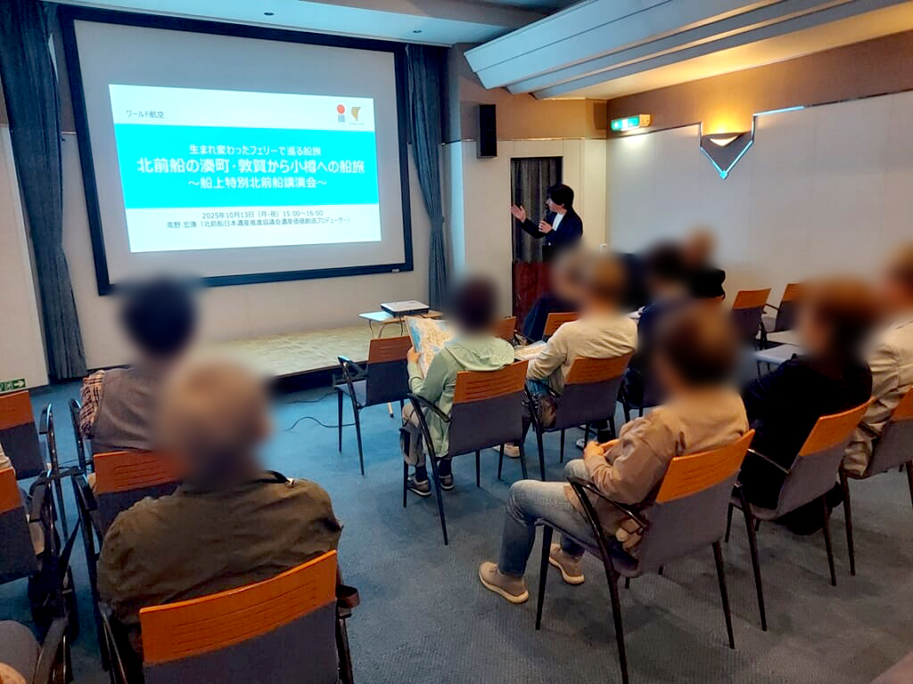 定期フェリーを利用し、福井県の敦賀から、新潟、秋田で途中下船をしながら、北海道の小樽を目指す壮大なスケールの新コース「北前船の湊町 敦賀から小樽への船旅」から戻りました。まさに実際に北前船のルートを船で辿りながら、北前船ゆかりの港町を訪ねるというテーマを実感できる旅でした。フェリーというと夜に出港し、翌朝目的地に到着するもので、長距離ドライブをする方にとっては自動車と共に寝ている間に目的地に着くものと考えがちです。新日本海フェリーの敦賀~新潟~秋田~苫小牧のルートは、週に1往復のみの運航ですが、昼間に航行する貴重なルート。なおかつ、最近のフェリーにはバルコニー付客室があったり、グリルレストランでのコース料理も味わえたりと、船旅を十分お楽しみいただけました。