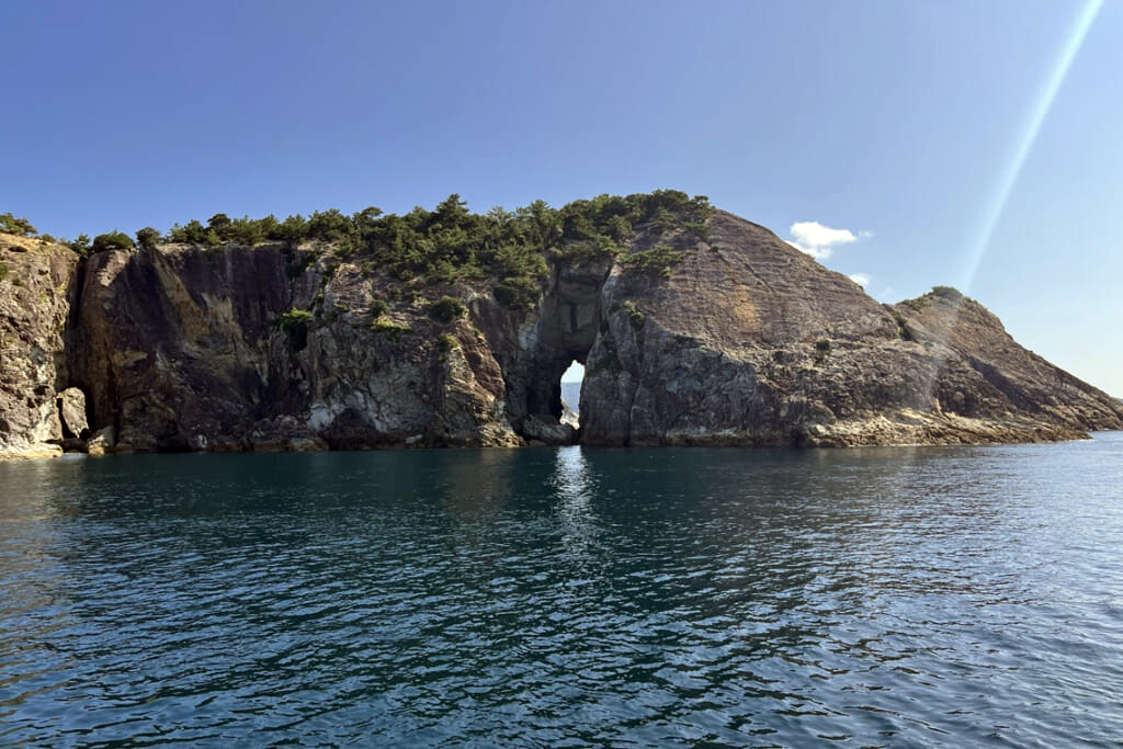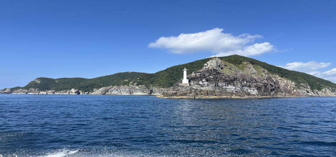 4日間すべて好天に恵まれ、五島列島の様々な風景をお楽しみいただけました。リアス式海岸やおぼれ谷など、複雑な海岸線が入り江や岬を形成し、五島の山と海が折り重なったような美しい景観を、チャーター船を使うことで陸からだけでなく、海からも眺めることができました。