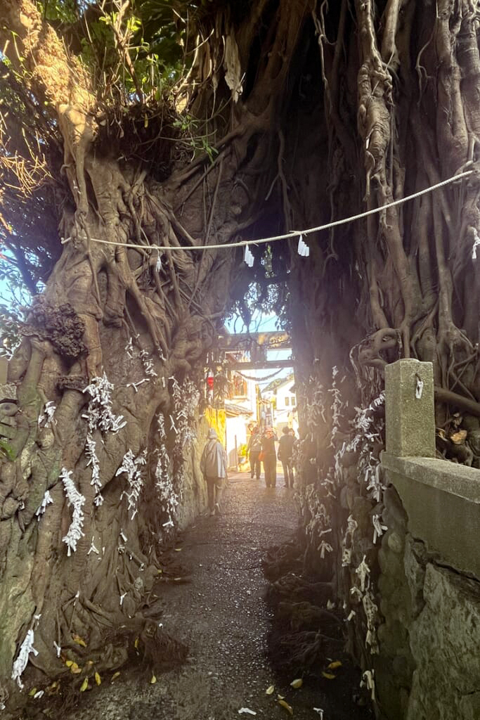 樹齢700年を超え、天然の鳥居を作っている奈良尾のアコウの木
