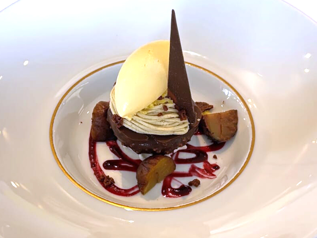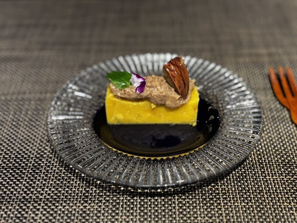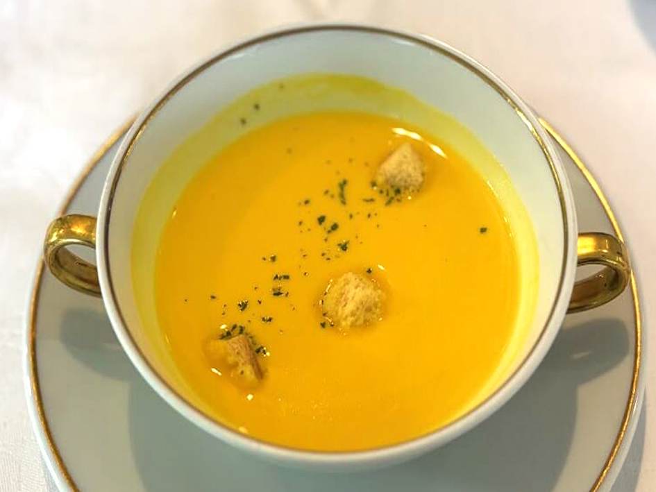 「こんぴらさん」の愛称で親しまれる金刀比羅宮の石段500段目にある「神椿」では、洋食をいただきました。店内や食器が青と白を基調とし、大きな窓からは金刀比羅宮の木々の緑を感じられ、開放的かつ洗練された空間でゆったりとお食事をお楽しみいただけました。どの料理も大変美味しく、特にデザートが絶品でした。旬の栗を使ったモンブランの上には資生堂パーラーのバニラアイスが乗せられ、酸味のあるカシスソースとともに味の組み合わせの変化を楽しみながらいただきました。