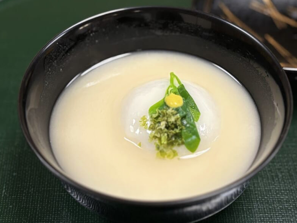 ツアー最後の夕食を飾るのは、高松の地で愛されてきた老舗料亭「二蝶」。一品一品、お料理も器も美しく、食材が生き生きとしているようでした。白味噌に餡餅が入った香川のお雑煮もご提供いただき、食べたことのない組み合わせに内心恐る恐る食べてみると、甘味と塩味のバランスが絶妙で、お客様にも大変ご好評でした。さらに香川県ならではだと感じたのは、締めがおうどんだったことです。温かい釜揚げうどんと冷たいざるうどんを選ぶことができ、私はざるうどんをいただきました。