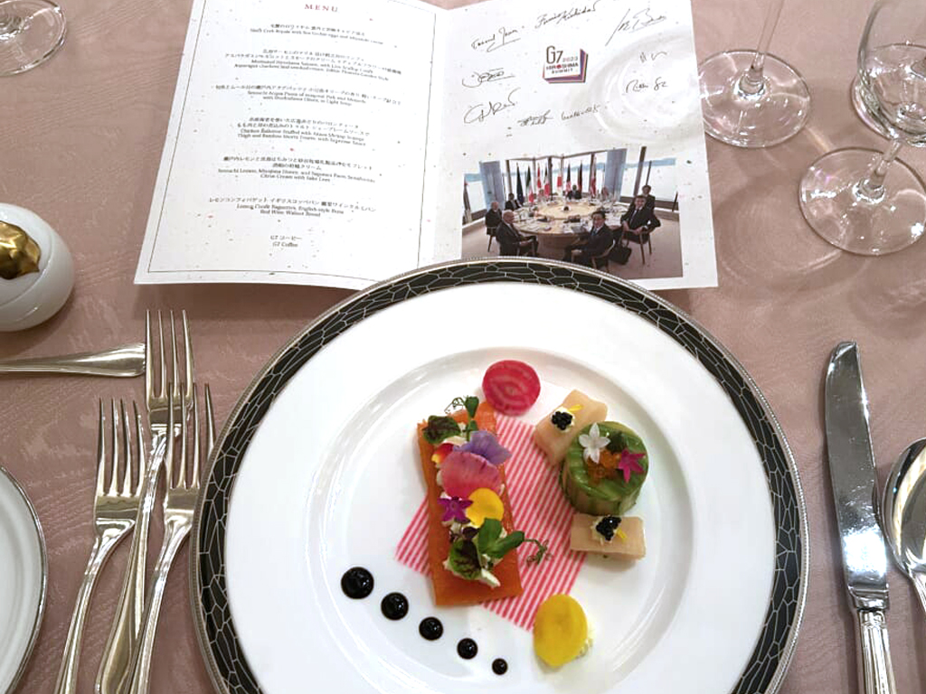 瀬戸内海国立公園に面した風光明媚な景観が人気の宇品島のグランドプリンス広島。このG7広島サミットのメイン会場となったホテルに滞在し、最終日の夕食で3団体合同の晩餐会を開催。各国首脳に提供されたお料理をアレンジした特別メニューをいただいてまいりました。 地元の最高品質の食材をふんだんに使い、一品一品を丁寧に仕上げたお料理は見た目も美しく、味わいも格別で至福のひとときでした。