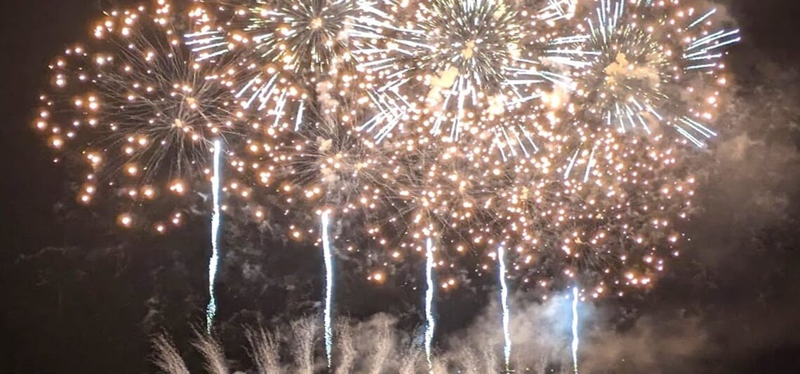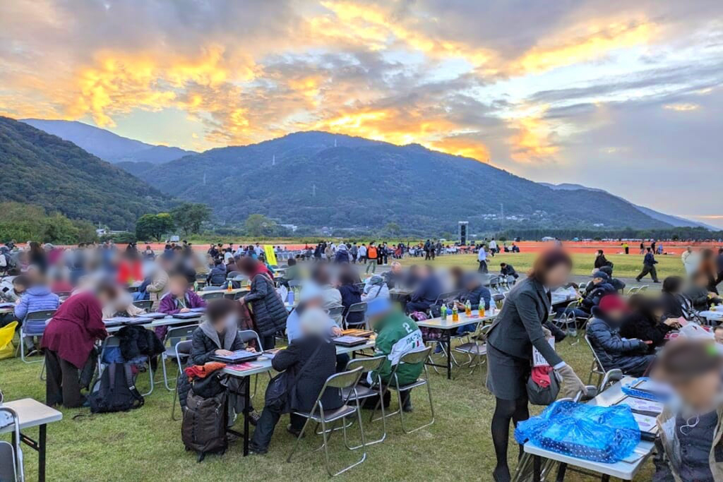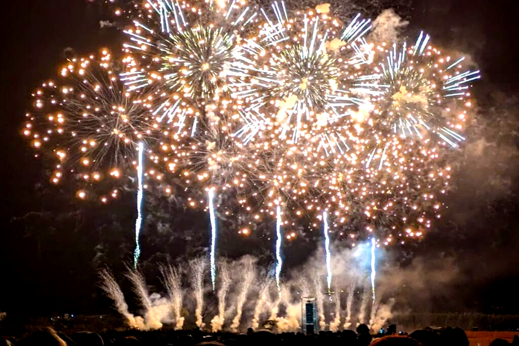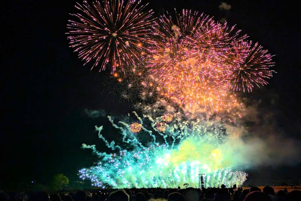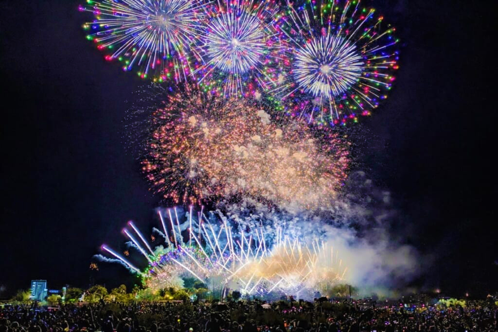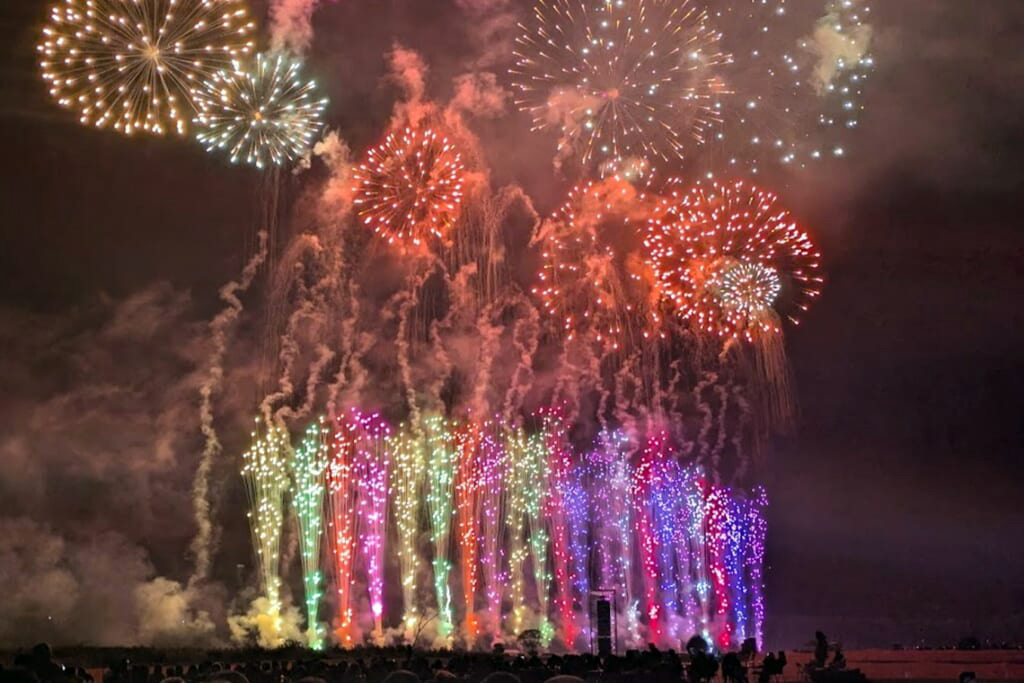 中四国では唯一行われる全国花火師競技大会が「にし阿波の花火」です。全国の花火師が徳島に集結し、多彩な技を競い合います。観覧席に着き、お弁当を食べながら花火の開始を待ちます。この間もステージでは音楽ライブが行われ出演者が会場を盛り上げます。西の空が茜色に染まり、そして真っ暗になるといよいよ花火の開幕です。オープニングプログラムは、徳島創業「元気ハツラツ!」でおなじみのあの企業が提供するドローンショー、会場全体でKANさんの楽曲「愛は勝つ」を大合唱、徳島だけに愛(藍)は勝つ‼