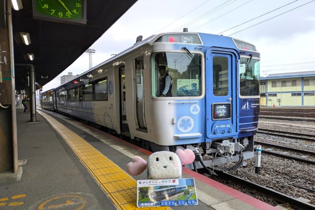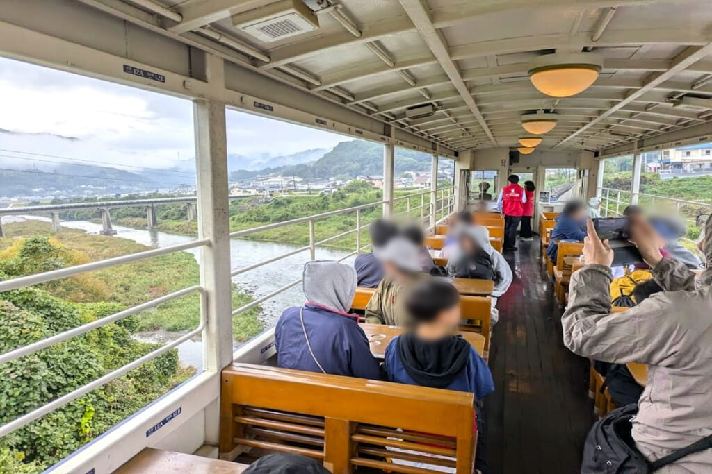 徳島駅から、JR四国が展開する「ものがたり列車」のひとつ「藍よしのがわトロッコ」に乗車し、ローカル列車の旅を楽しみました。あいにくの雨模様でしたが、トロッコ車両から吉野川の流れや徳島の自然を満喫し、沿線の方々や地元の高校生の温かいもてなしを受けました。車内では温かい飲み物を飲んだりお弁当を食べたりし、あっという間に阿波池田駅に到着しました。