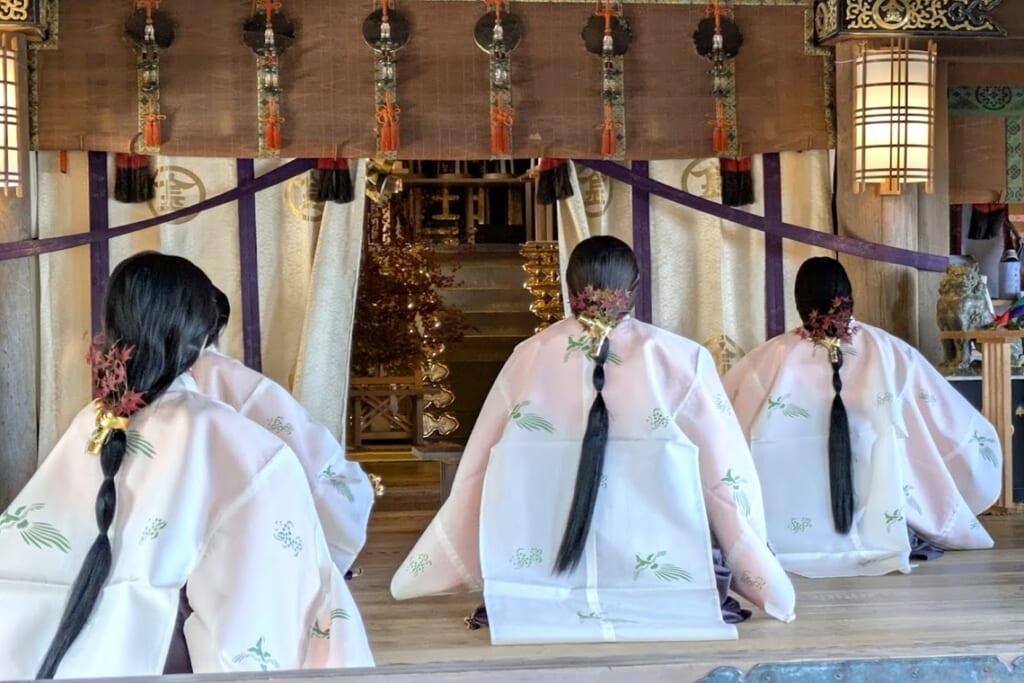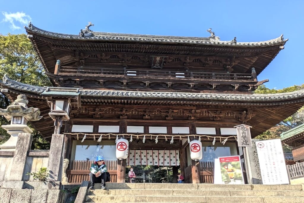 785段の階段で有名な金刀比羅宮ですが、今回は境内の入口にあたる大門までジャンボタクシーで一気に移動しました。大門でガイドの古川さんと合流し、面白い解説を聞きながら参道を登りました。重要文化財の「十一面観音立像」を納める宝物館や、金刀比羅宮の旧神宮寺の金堂として建立された旭社を見学し、御本宮へ。この日はちょうど金刀比羅宮の紅葉祭が行われており、古式ゆかしい衣装をまとった巫女の舞もご覧いただきました。