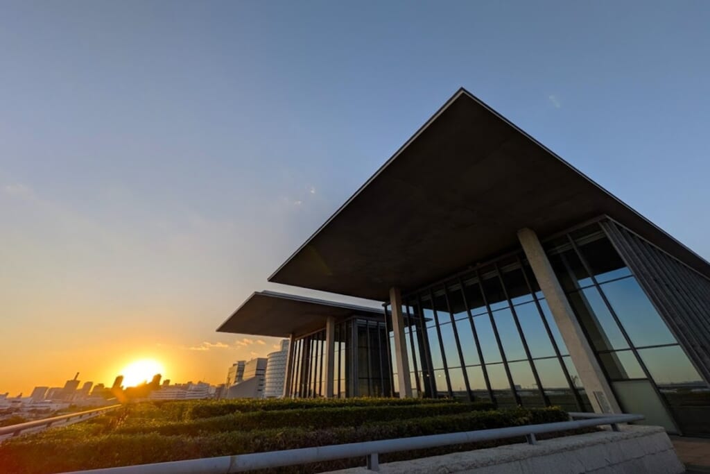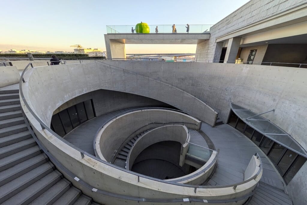 直島でも安藤建築をたっぷりご覧いただきましたが、兵庫県立美術館は安藤忠雄さんの意匠が詰まった名建築です。「コンクリート打ちっぱなし」の幾何学的な造形や、光と影、内外の境界を曖昧にするデザインなど、建物自体が芸術作品として見どころが尽きません。今回訪れたのは太陽が沈みゆく時間だったため、特に美しい風景を楽しめました。