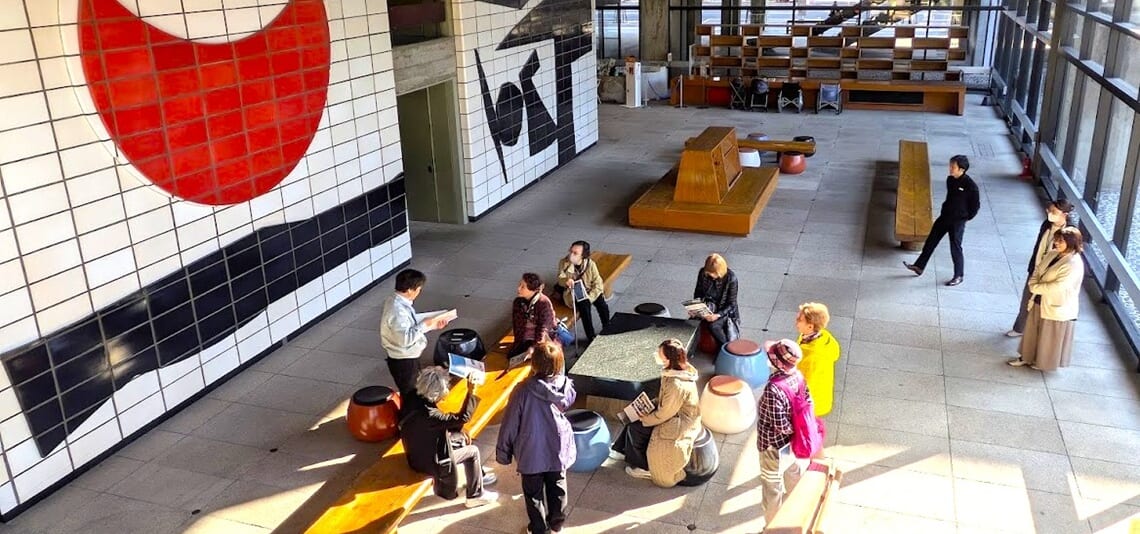 高松の町を歩くと、多くの近現代の名建築に出会えます。今回は高松に2泊し、そうした建築物を訪ね歩きました。まず、丹下健三氏設計の「香川県庁舎 東館」を、県の職員の方の説明を受けながら見学しました。ピロティから建物内部に入ると、芸術家・猪熊弦一郎氏やデザイナー・剣持勇氏など、日本を代表するクリエイターが携わった作品が目に飛び込んできました。