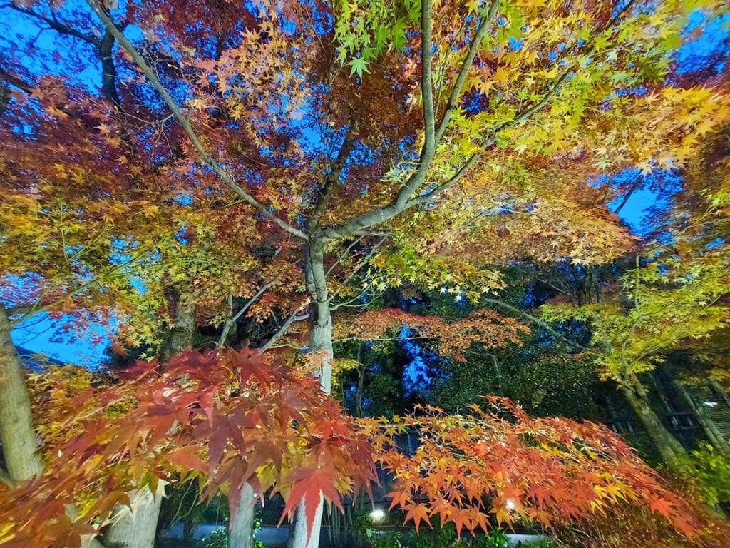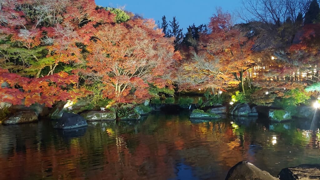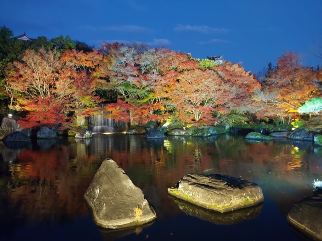 姫路でのこの季節ならではの特別プログラムが「好古園の紅葉ライトアップ」でした。毎年、西日本の紅葉名所の上位に選ばれる「好古園」。夕刻に入場し、ライトアップを楽しみました。暗さが増すにつれ、鮮やかさを増す紅葉は、まさに息を呑む美しさでした。平日であったせいか、それほどの混雑もなく見学できたのも良かったです。