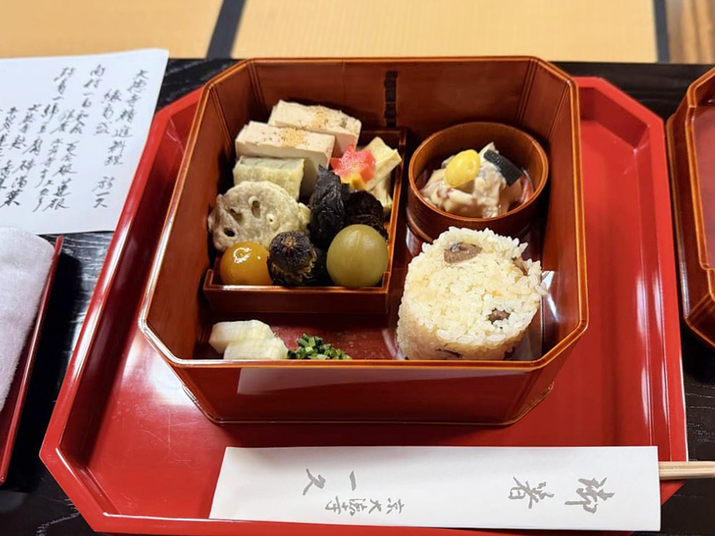 前述の料亭「西陣魚新」での夕食とは打って変わって、2日目の昼食は、大徳寺の参道にある「大徳寺一久」にて、精進料理をお楽しみいただきました。正直、あまり期待をしていなかったのですが、非常に手の込んだ料理で、肉や魚を使わずにこれほど美味しいとは驚きました。また有名な大徳寺納豆は、イメージする現代の納豆とは全く違う味わいで、帰りにお土産に買われる方もいらっしゃいました。最後の夕食は旧島津製作所の建物を改装したフレンチレストラン「フォーチュン・ガーデン」にて。お店の雰囲気も味も良く、皆様で乾杯をしてゆっくりと楽しみました。芸術だけではなく食欲も満たされた旅でした。
