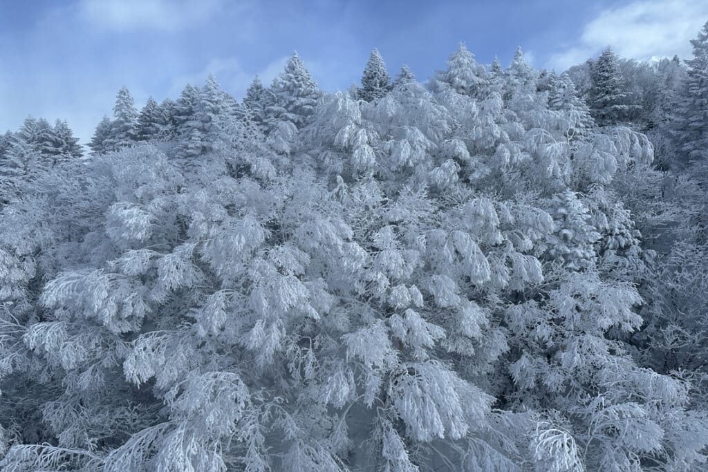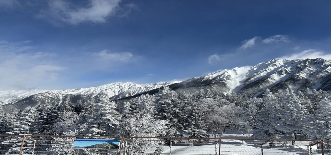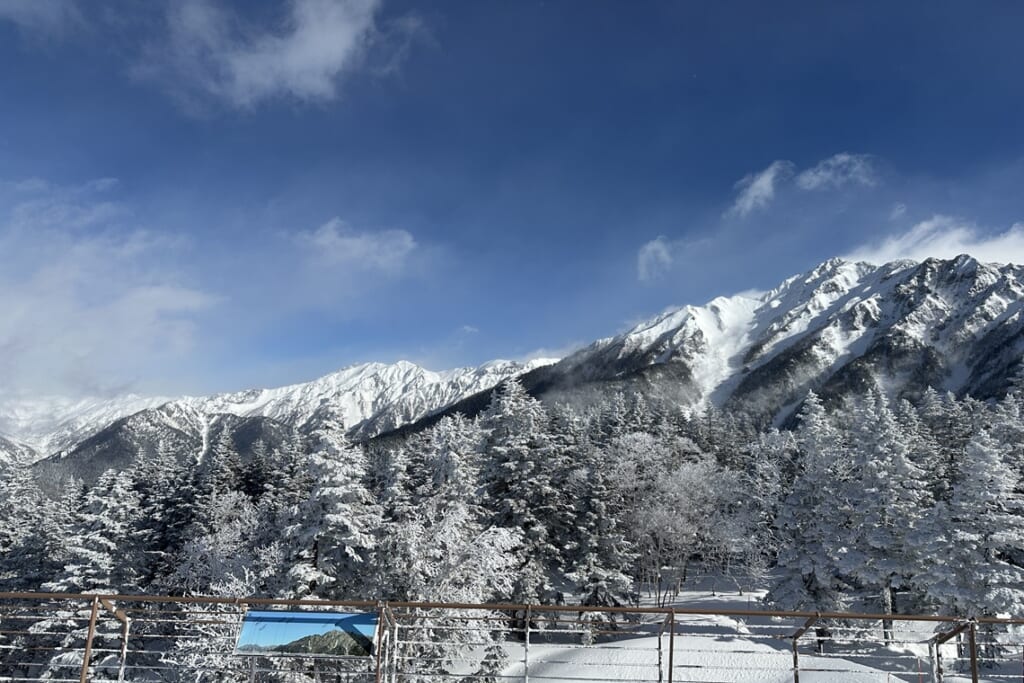 新穂高ロープウェイでは、麓とは異なる雪景色が広がりました。ゴンドラの車窓からは、雪をまとった樹々や山肌の表情を間近にご覧いただき、移動そのものも見どころの一つとなります。山頂駅に到着後は、屋上展望台「AlpScape(アルプスループ)」へ。視界が開けた先には白銀の山々が連なる大パノラマが広がり、冬の澄んだ空気とともに、奥飛騨の山岳景観をご堪能いただきました。展望台からは、西穂高の稜線が雪化粧をまとってくっきりと浮かび上がり、時間帯によっては雲の切れ間から槍ヶ岳が姿を見せる場面もありました。遠景まで見通せる日には、山々のスケール感がより際立ち、写真撮影を楽しまれる方も多くいらっしゃいました。