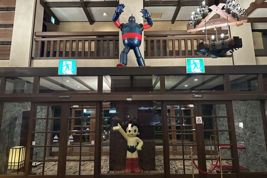 奥飛騨に構える「穂高荘 山のホテル」では、また異なる温泉の醍醐味が待っていました。ロビーでは、かつての社長さんが展示会のために集めたという「鉄腕アトム」や「鉄人28号」などのフィギュアたちが、どこか懐かしい遊び心で出迎えてくれます。この宿の自慢は、専用のゴンドラ「湯めぐり鉄道」で斜面を降りた先にある、蒲田川のせせらぎを間近に臨む広大な露天風呂です。北アルプスの山懐から湧き出る豊かな湯量は圧巻で、湯気の向こうに雪景色を眺めながらの入浴は、自然と一体になるような高揚感を与えてくれました。冷涼な外気を感じながら、熱めの湯に肩まで浸かる雪見風呂は、冬の旅だからこそ味わえる贅沢です。