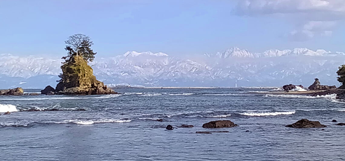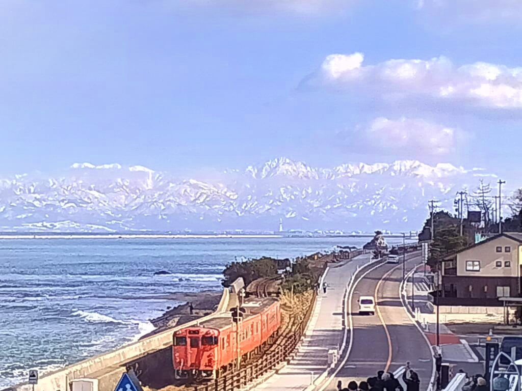 氷見へ向かう途中、雨晴海岸に立ち寄りました。この日は天気予報どおりに青空が広がり、海越しに3000m級の立山連峰がくっきりと姿を現しました。雨晴海岸は海の向こうに高峰を望むという世界でも珍しいスポットですが、山がこれほど鮮明に見える日は年間60〜80日ほどと言われています。雪をまとった山々の雄大さと美しさは言葉を失うほどで、ちょうどJR氷見線のオレンジ色の車両が立山連峰を背景に走り抜けるシーンも目に焼き付いています。冬の雨晴海岸の絶景をこれほどの好条件で見られたことは、この旅の大きな幸運でした。
