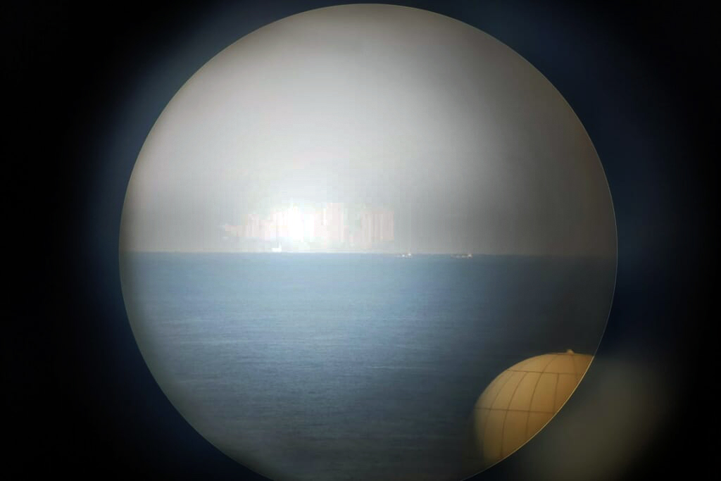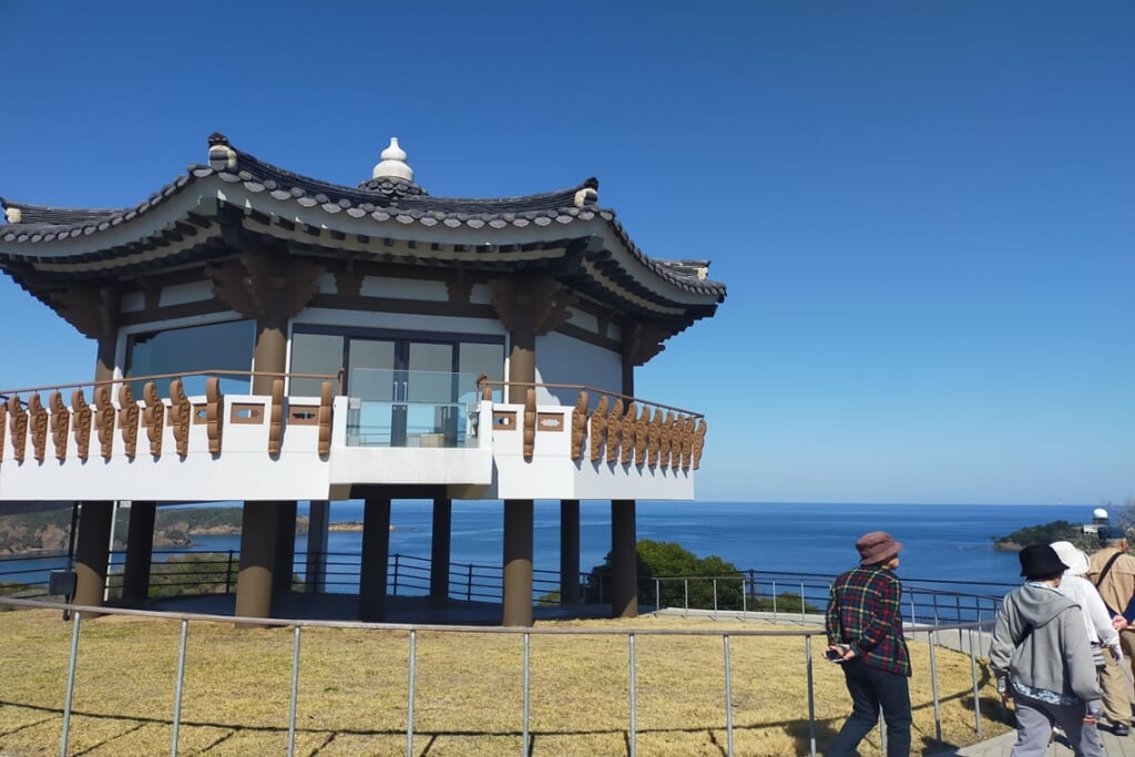 水平線にうっすらと見える釜山の街並み。右下の白いドームは航空基地のレーダー基地。今も昔も大陸との結節点です