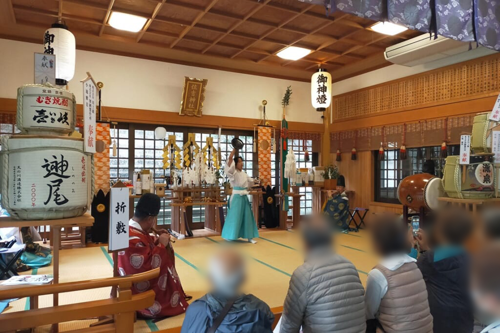 住吉神社では、「壱岐神楽」鑑賞をお楽しみいただきました。国生み神話では5番目に誕生した島とされる壱岐。島内には150を超える神社があり、暮らしと信仰が深く結びつく島でもあります。壱岐神楽は約700年の歴史と伝統を持つ神事で、国指定重要無形民俗文化財に登録されています。そんな壱岐神楽の大きな特徴は神楽舞も音楽も現職の神職のみで行われること。他の神楽は、神楽を上演する団体があり、芸能の面が強いものが一般的ですが、壱岐神楽は本来の神事としての厳かさが今なお残っています。年末の大大神楽(だいだいかぐら)は7~8時間に及ぶ本格的なものですが、今回は約1時間の特別公演として見学させていただきました。演目は全35演目の中でも人気のある「二弓(にきゅう)」「篠(ささ)」「八咫烏(やたがらす)」「折敷(おしき)」の4つ。特に最後の「折敷」は今年高校生になったばかりの現職神職のご子息によるもので、最後に相応しい、ダイナミックで完成度の高い舞を披露してくださいました。