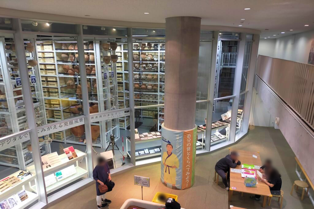 壱岐市立一支国博物館の「魅せる収蔵庫」。出土品の収蔵庫がガラス張りになっており、復元作業を行うバックヤードなども来場者に見せてくれます