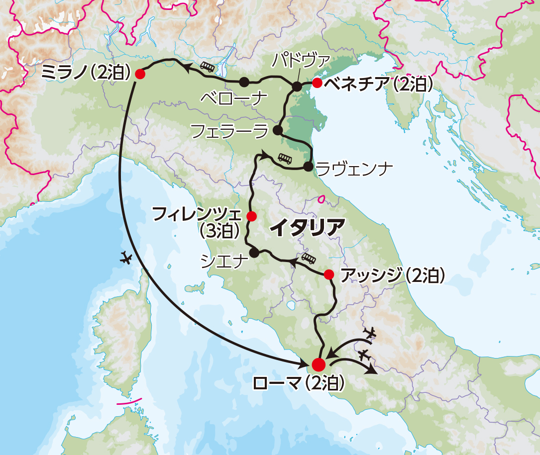 - ルネッサンス芸術をテーマに、ローマから北上しミラノへ、全宿泊地に連泊する行程でイタリアを周遊します。