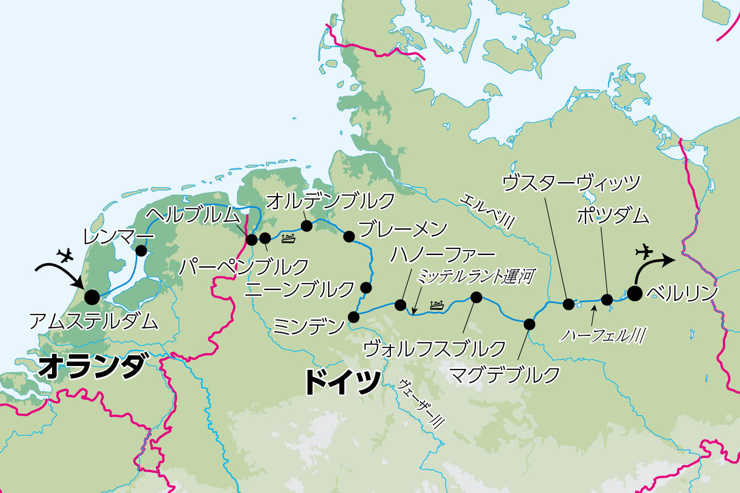 - オランダのアムステルダムからドイツのベルリンへ、川と運河を結びながら11泊12日のクルーズを楽しみます。