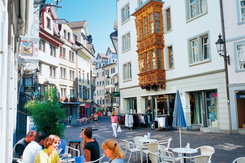 スイス東部のザンクトガレンは、世界遺産に登録された修道院図書館を中心に、中世の街並みが美しく残る静かな古都です。刺繍産業で栄えた歴史を物語る装飾窓や、中世の街並みを残す旧市街の散策も魅力です。また、ご希望の方は、アッペンツェルへの小旅行にご案内します(実費)。牧草地に囲まれ、カラフルな伝統木造家屋が立ち並ぶ小さな町には、昔ながらのスイスの伝統が今も息づいています。