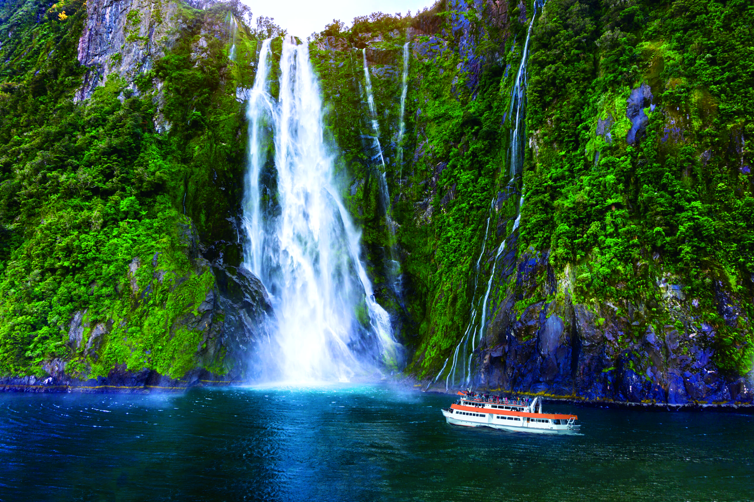 世界自然遺産ミルフォードサウンドは10万年の歳月をかけ大自然が造り上げた、断崖絶壁に囲まれているフィヨルド。海から突き出たように連なる山々から流れる滝など、ダイナミックな景観をクルーズでご覧いただきます。