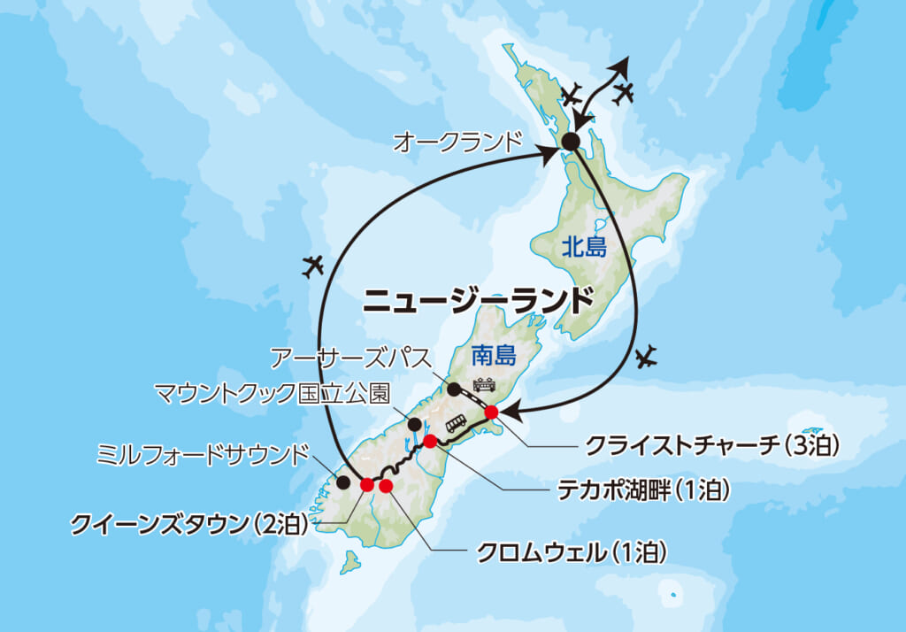 - 往復ニュージーランド航空プレミアムエコノミークラスを利用しお体に負担を少なくご案内します