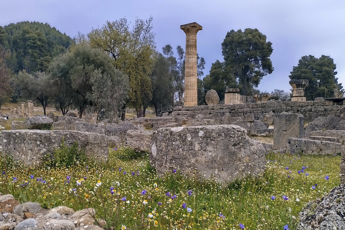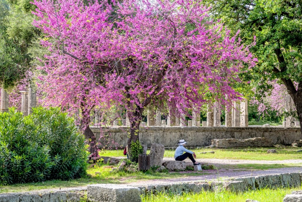 この時季ならではのオリンピア。花々と古代遺跡のコントラストが見ものです。