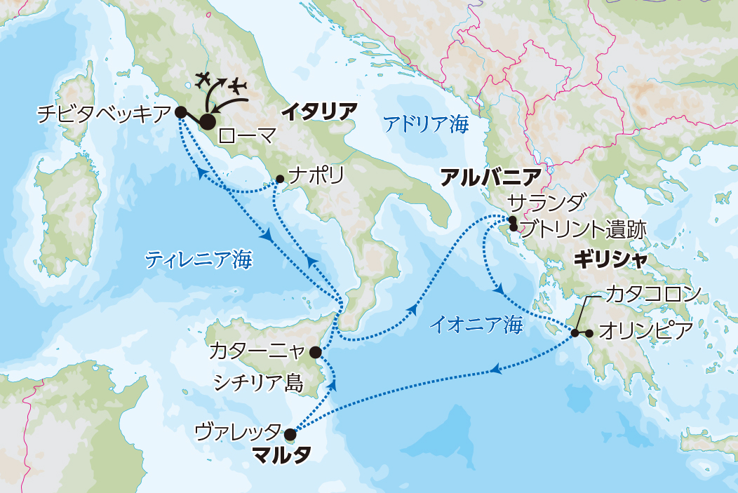 ■着後、航空機を乗り換え、ローマへ。 ■着後、バスにてチビタベッキアへ。「サファイア・プリンセス」に乗船します。 ■夕方、アルバニアのサランダへ向けて出航します。 【7連泊】(サファイア・プリンセス:船中泊) |