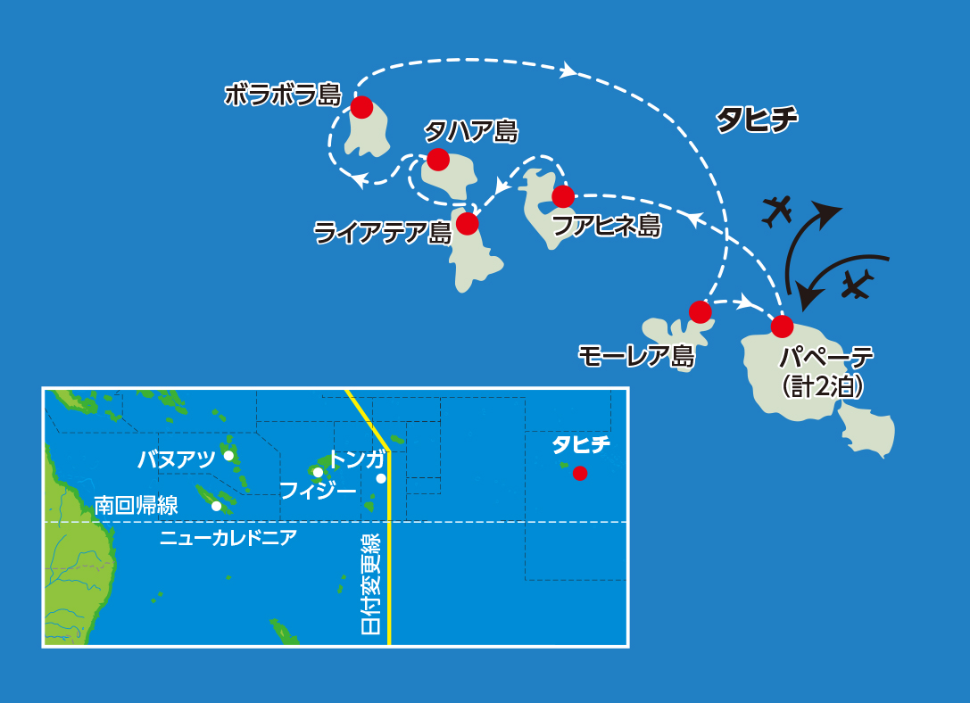 タヒチの歴史文化を伝えるフアヒネ島、世界遺産を擁するライアテア島へも寄港します。