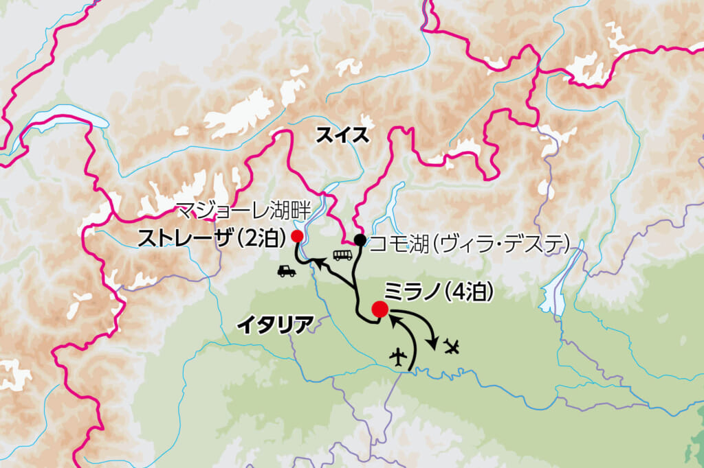 - 風光明媚なマジョーレ湖畔と洗練された街ミラノ、いずれも歴史ある高級ホテルにて連泊滞在です。伝統と気品あるホテルライフをお楽しみください。