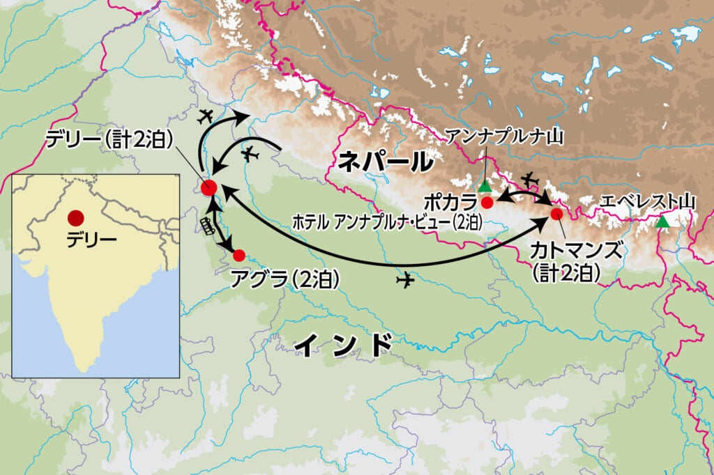 ※日程表の時刻は羽田空港発着のエア・インディアの便を想定したものです。他の便や他の航空会社を利用の場合には、発着空港および時刻、日程は異なります。