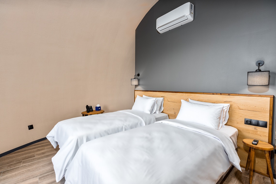 ツアー最後の宿泊はステパンツミンダ(旧名カズベキ)にあるマウンテンリゾートホテル「ルームズ」にて、カズベキ山を望む客室をご用意しました。天候に恵まれれば客室やテラスから間近に秀峰カズベキをご覧いただけます。