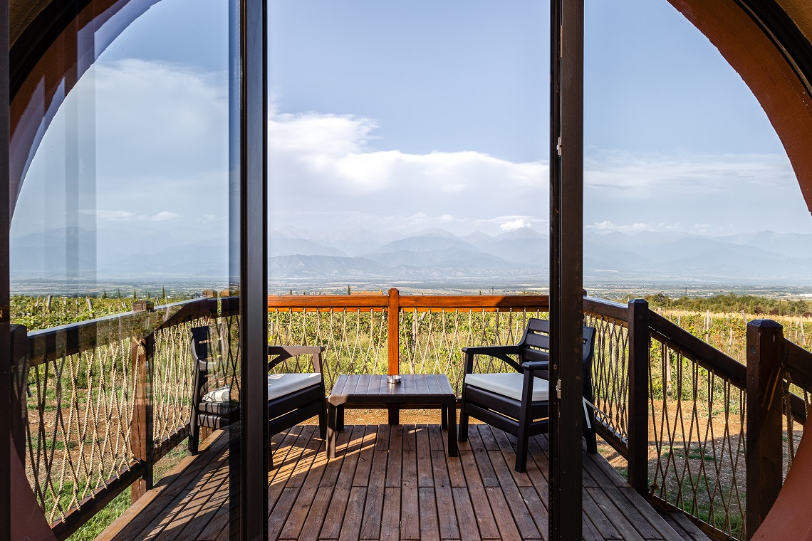 ジョージアワインの産地カヘティ地方にあるユニークなホテルでのご宿泊をお楽しみください。ワイン造りが盛んなこの地域では、ワインの醸造に伝統的なクヴェヴリと呼ばれるテラコッタ製の壺が用いられてきました。ホテルの敷地には、その形を模したロッジ型の客室が点在しています。周囲にはぶどう畑が広がり、この地方らしいのどかな雰囲気が味わえるのが魅力です。
