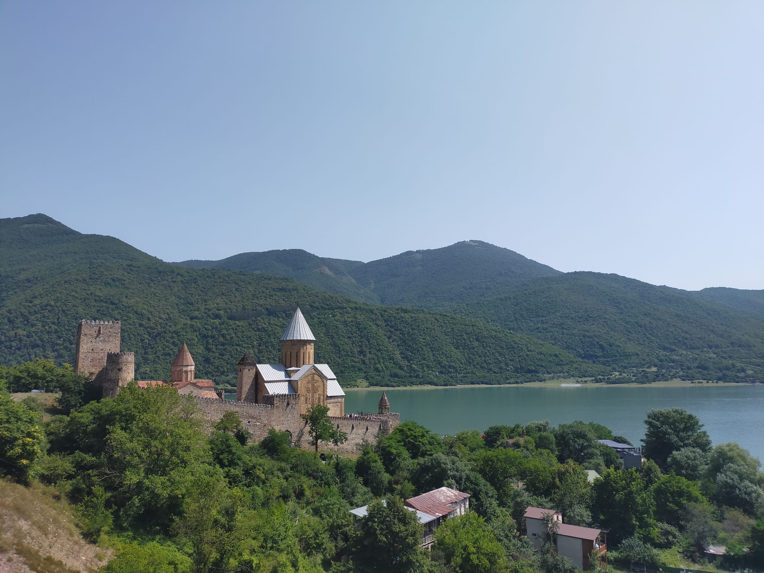 トビリシからジョージア軍用道路を北上すると、アラグビ川を堰き止めたジンヴァリ貯水湖のほとりにアナヌリの要塞教会があります。この地域は緑の山々とダム湖を背景に色のコントラストを成し、絵のように美しく、息を飲むような眺めです。要塞内の2つの教会は聖母マリアに捧げられたもので、ジョージアの中世建築の代表と言えます。大きな教会は「昇天教会」と呼ばれ、1689年に建設。聖書の場面を描いた精巧な彫刻やフレスコ画が特徴です。小さな教会は「聖ゲオルギオス教会」で、16世紀のものです。後に侵略者から教会を守るために見張り塔と防御壁が付け加えられ、要塞教会となりました。