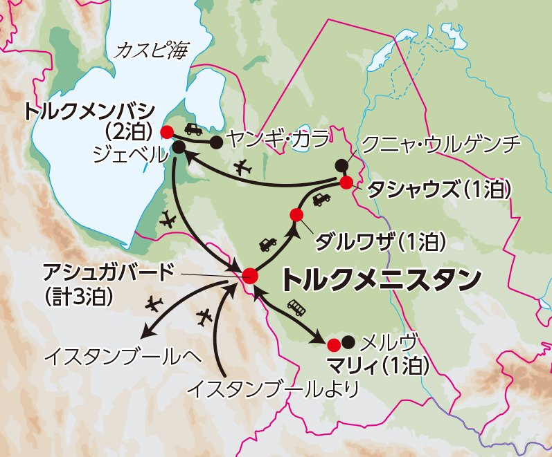 ■午前、成田空港より航空機にて、イスタンブールへ。 ■イスタンブールにて航空機を乗り換え、トルクメニスタンの首都アシュガバードへ。 ■着後、ホテルにチェックイン。 【2連泊】(アシュガバード泊) |
