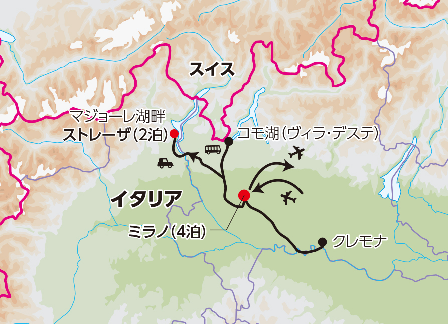 ストレーザ																			(ベッラ島)																	 | ■午前、船にてベッラ島へ向かい、湖に浮かぶ●ボッロメオ宮殿を見学します。 ■午後、ストレーザに戻り自由行動。 (ストレーザ泊) |  |