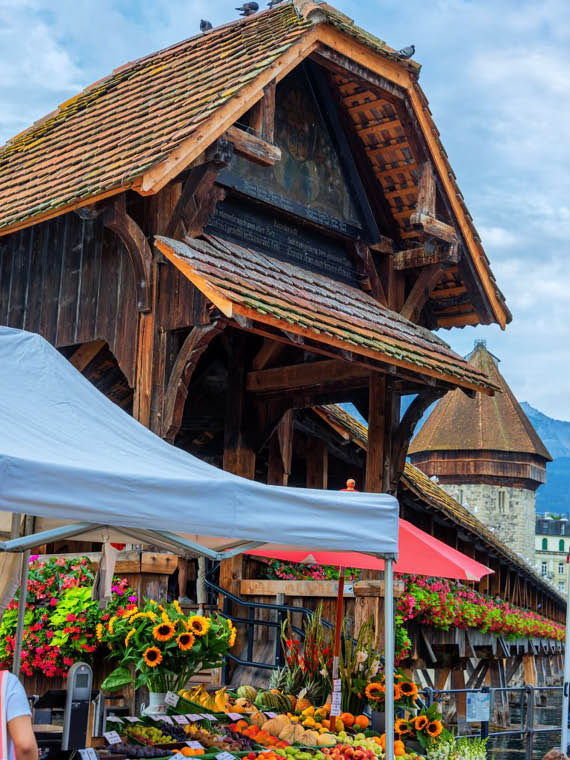 ルツェルンは風光明媚な湖、山々を周辺に有し、観光素材にも事欠かないスイスを代表する湖畔のリゾートですが、お勧めは、毎週火曜日と土曜日に開催されるマーケット。市内を流れるロイス川沿いのカペル橋周辺に長い軒を連ねるマーケットは、花屋や野菜売りなど農家さんが集まり地元感溢れる市がたちます。朝の散歩がてらに愉しむにも丁度よい規模です。好立地のホテルに宿泊しているからこそ、朝夕のプロムナード散歩もお勧めです。