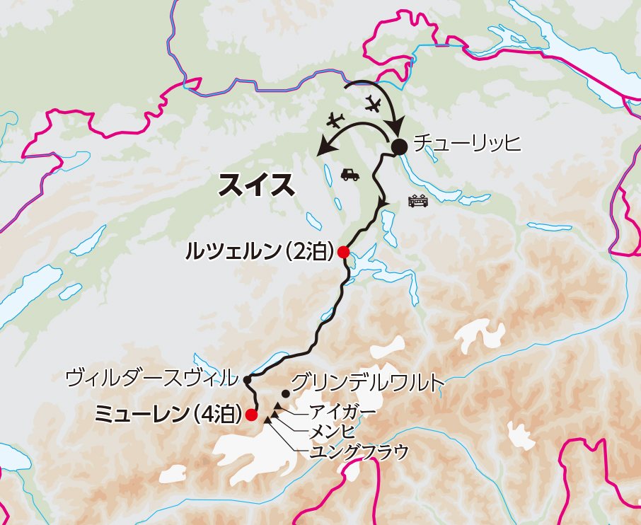 ミューレン																			クライネシャイデック																			グリンデルワルトターミナル																			メンリッヘン																			ヴェンゲン																			ミューレン																	 | ■終日、登山列車とロープウェイを利用し、様々な角度からベルナーオーバーラント地方の大自然を楽しみます。 ■午前、列車にてクライネシャイデックを経由し、アイガーグレッチャーへ。2020年に開通したアイガーエクスプレスに乗車し、グリンデルワルトターミナル駅に向かいます。 ■その後、アイガーを望みながらメンリッヘンまでの空中散歩を楽しみ、ロープウェイでヴェンゲンへ向かい散策。 ■夕刻、列車にてミューレンへ戻ります。 (ミューレン泊) |  |