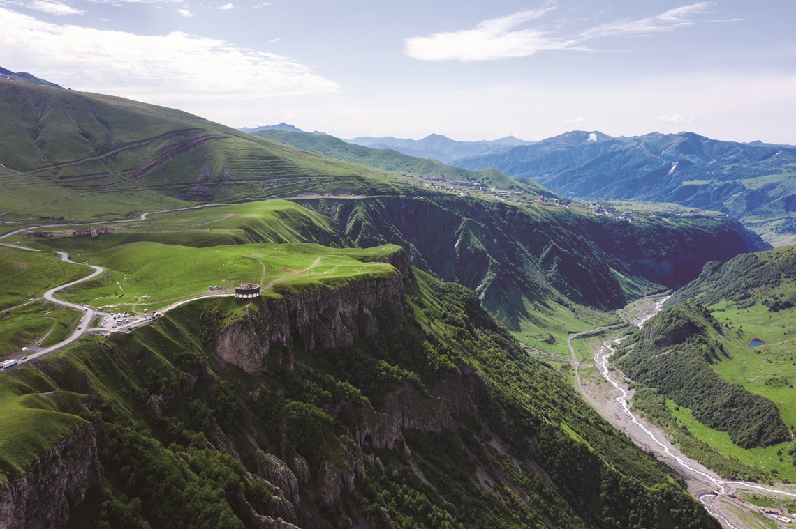 山岳風景が広がるジョージア軍用道路をドライブし、カズベキ峰を望むステパンツミンダに宿泊