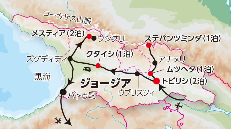 ■メスティアよりトルコ国境に近いバトゥミへ。 ■夜、航空機にてイスタンブールへ。 (機中泊) |