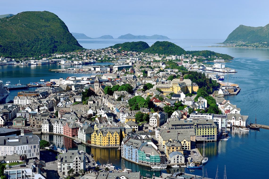 ノルウェーで最も美しい町の一つ。1904年の大火災後、家屋がすべて当時流行していたアールヌーヴォー建築で再建され、のちに住民たちによってカラフルに彩られるようになりました。美しい町並みの散策をお楽しみください。